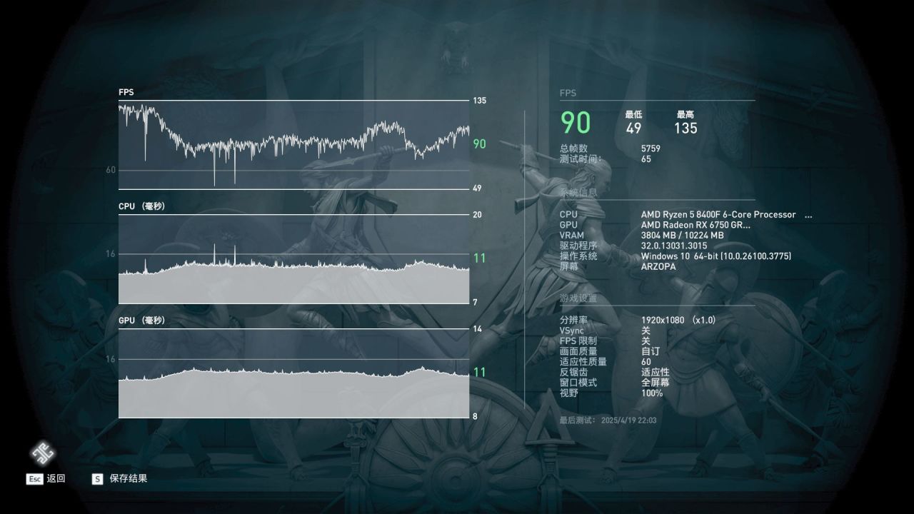 经过实测,在玩《刺客信条:奥德赛》这款游戏时,使用AMD 锐龙 5 8400F处理器和AMD Radeon RX 6750 GRE 10GB显卡进行测试,在自定义画质下,实测1080P分辨率(1920× 1080)运行游戏,画面平均帧率能够稳定保持在90 帧/每秒。