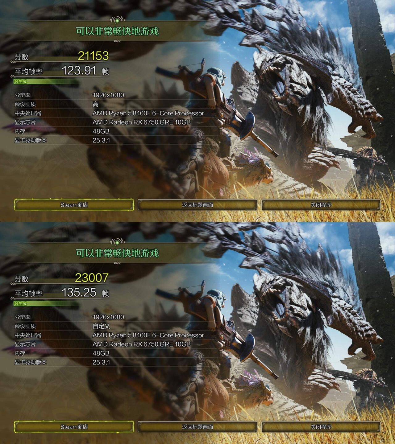 经过实测,在玩《怪物猎人:荒野》这款游戏时,使用AMD 锐龙 5 8400F处理器和AMD Radeon RX 6750 GRE 10GB显卡进行测试,在默认预设高画质下,实测1080P分辨率(1920× 1080)运行游戏,画面平均帧率能够稳定保持在123.91 帧/每秒;在自定义画质下,实测1080P分辨率(1920× 1080)运行游戏,画面平均帧率能够稳定保持在135.25 帧/每秒。