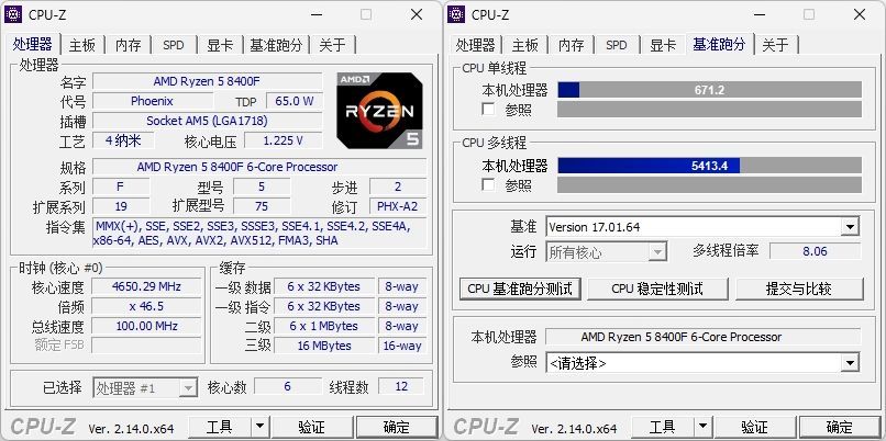 使用CPU-Z软件测试,单核心性能得分为:671.2,多核心性能得分为:5413.4。