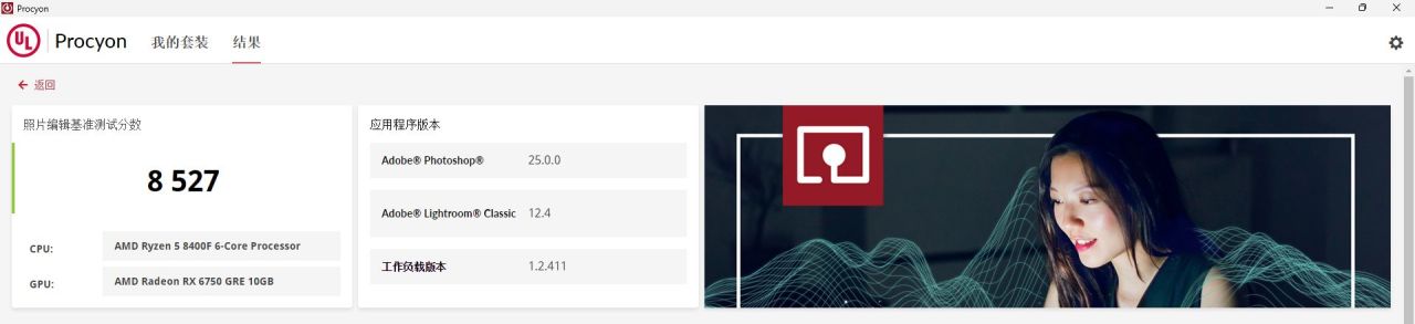 使用Procyon软件对整机硬件进行测试,在照片编辑基准测试分数的测试页面,也就是基于Adobe Photoshop和Adobe Lightroom Classic进行测试,得分情况如下: