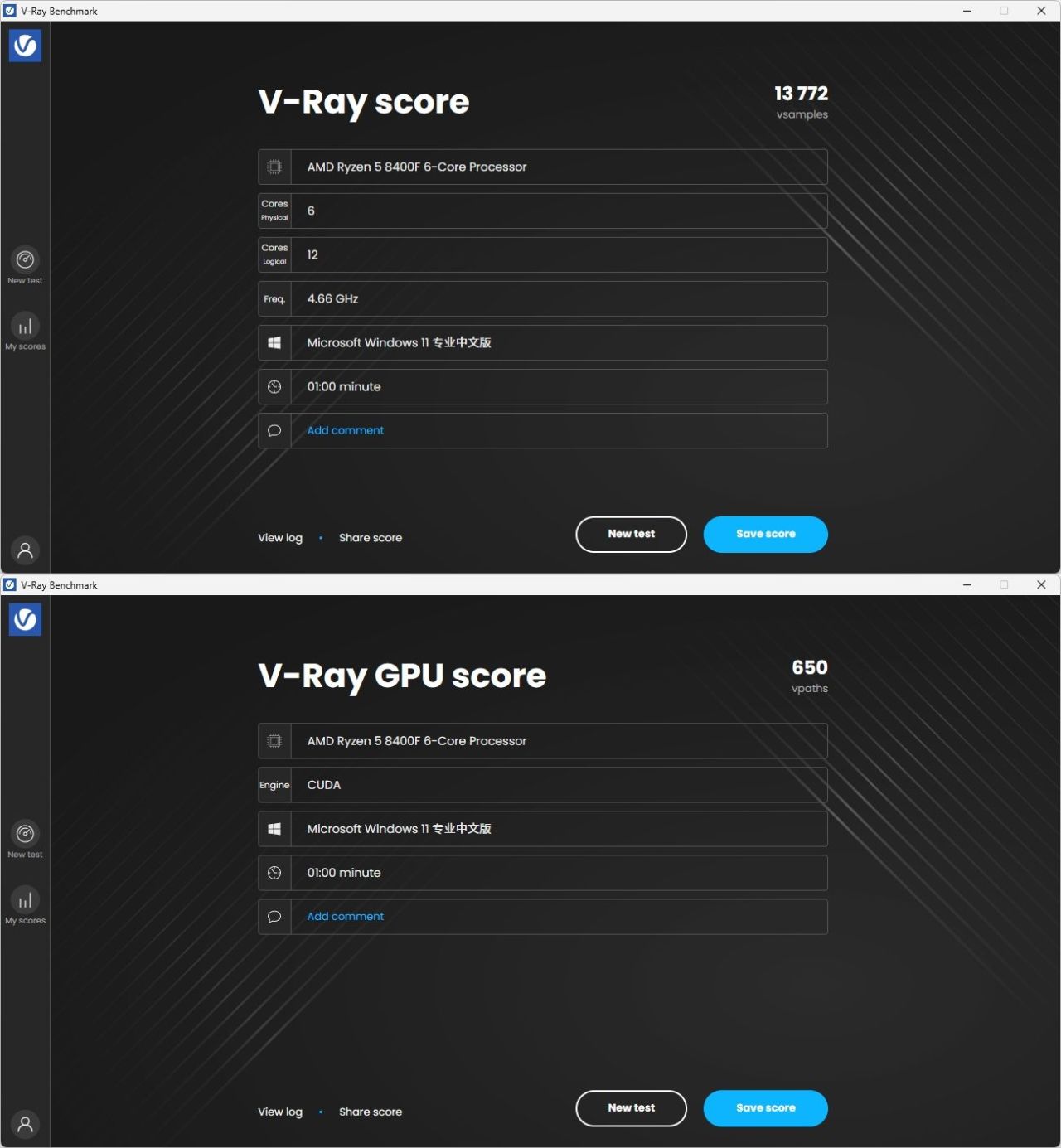 使用V-Ray Benchmark软件测试,V-Ray性能得分:13772,V-Ray GPU得分:650。