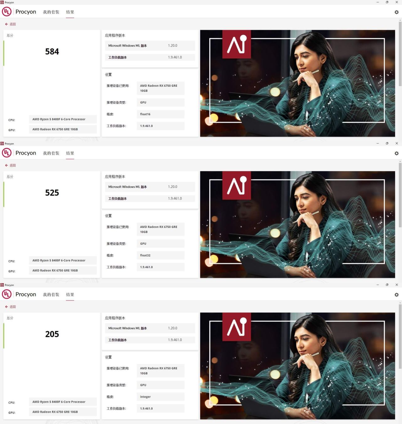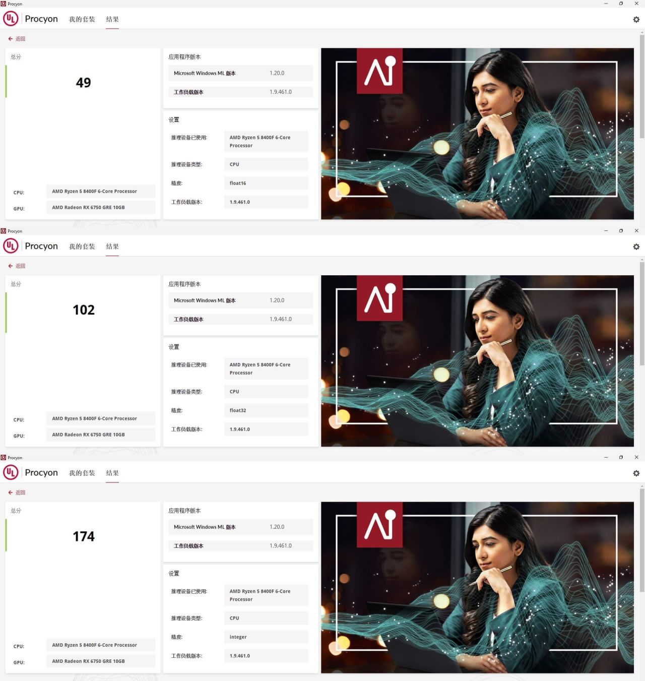 使用Procyon软件对处理器进行测试,在Microsoft Windows ML版本的测试页面分别进行三项精度测试,得分情况如下: