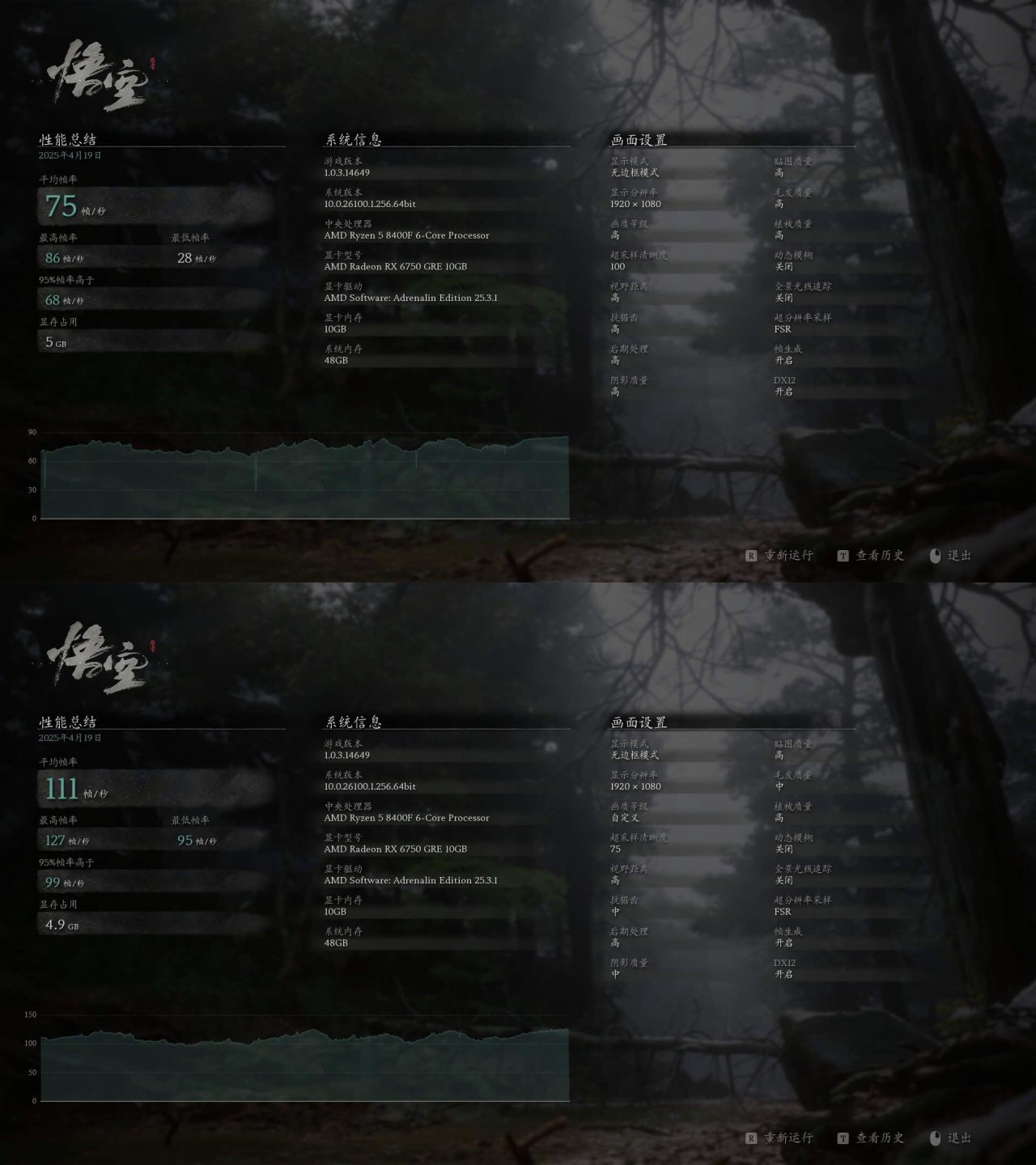 经过实测,在玩《黑神话:悟空》这款游戏时,使用AMD 锐龙 5 8400F处理器和AMD Radeon RX 6750 GRE 10GB显卡进行测试,在默认预设高画质下,实测1080P分辨率(1920× 1080)运行游戏,画面平均帧率能够稳定保持在75 帧/每秒;在自定义画质下,实测1080P分辨率(1920× 1080)运行游戏,画面平均帧率能够稳定保持在111 帧/每秒。