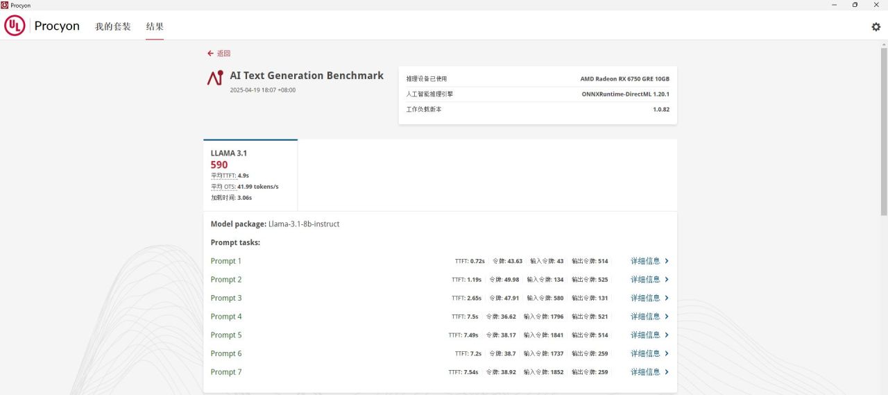 使用Procyon软件对整机硬件进行测试,在AI Text Generation Benchmark基准测试分数的测试页面,也就是基于ONNXRuntime-DirectML项目进行测试如下: