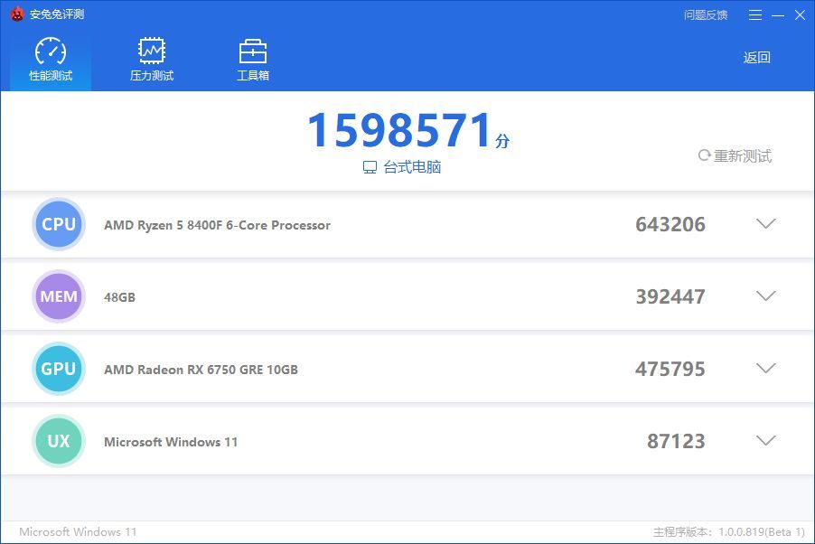使用安兔兔PC评测软件对整机进行性能测试,其中CPU分数为:643206,内存分数为:392447,GPU分数为:475795,UX分数为:87123,整机综合硬件性能得分为:1598571分,也就是159.8万分。