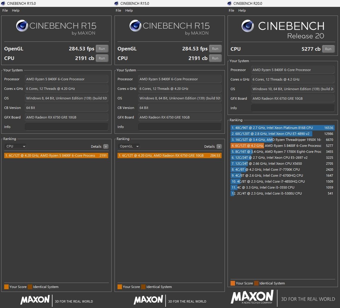 使用CINEBENCH R15软件测试,CPU性能得分:2191 cb,OpenGL性能得分:284.53 fps。使用CINEBENCH R20软件测试,CPU性能得分:5277 cb。