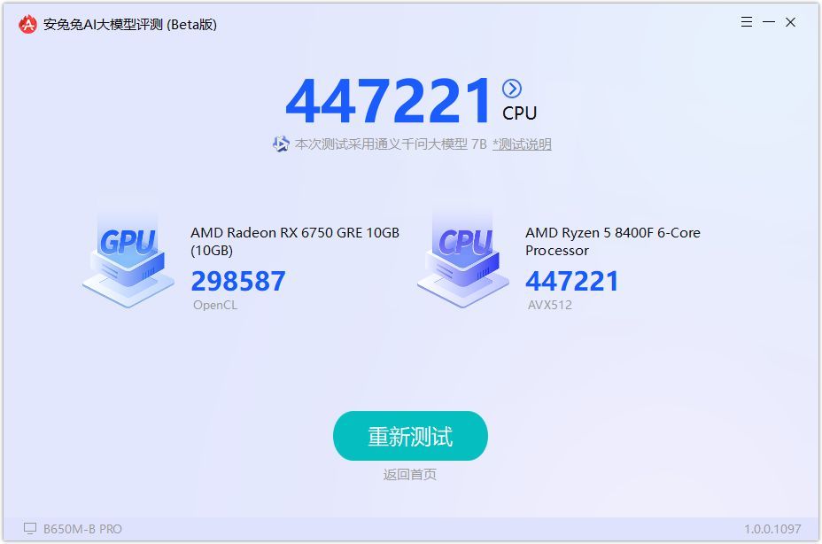 使用安兔兔AI大模型评测软件对整机进行性能测试,其中GPU(OpenCL)分数为:298587,CPU(AVX512)分数为:447221,测试AI大模型为:通义千问大模型7B。