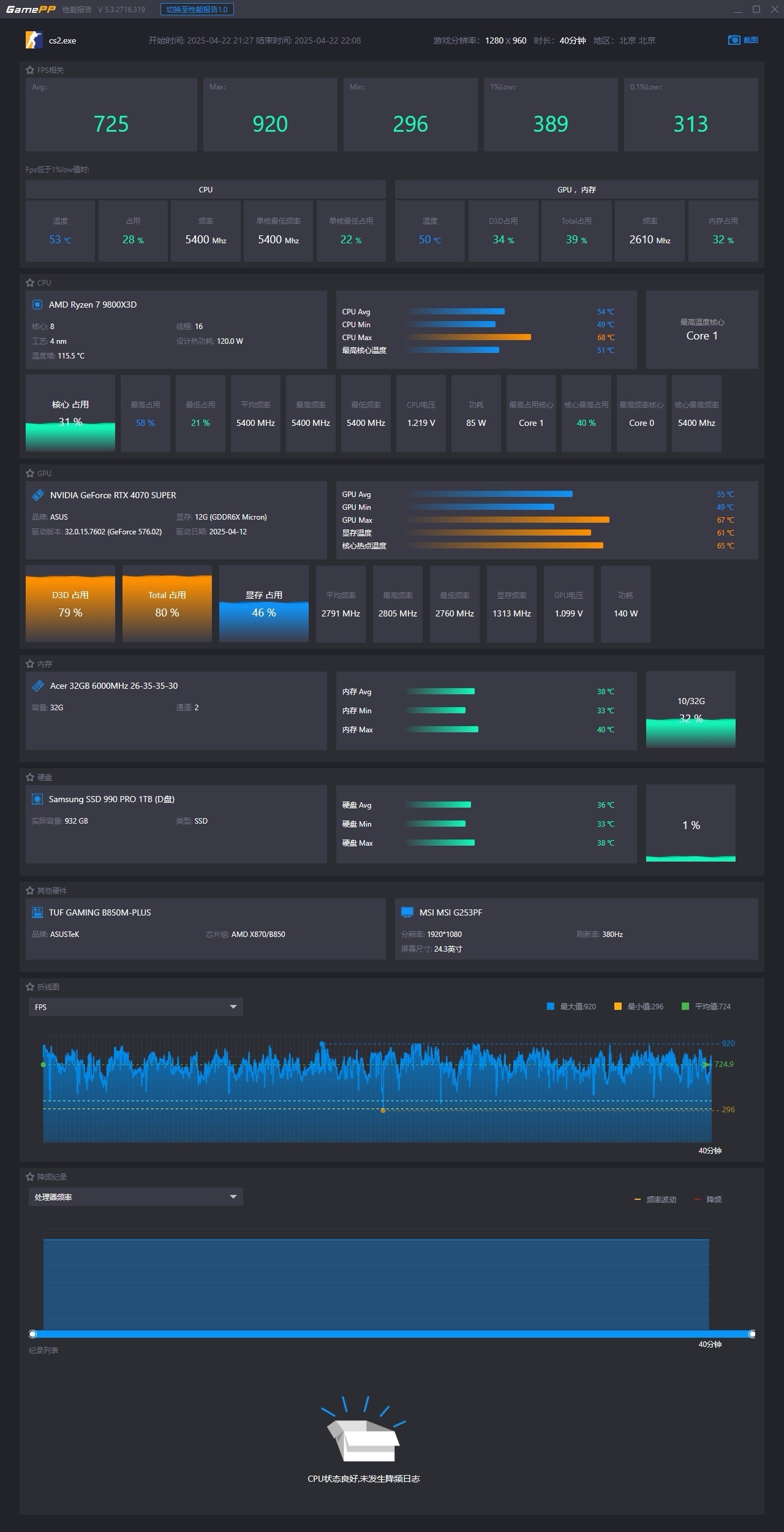 平均FPS爲725,1%Low 爲389,0.1%Low爲313