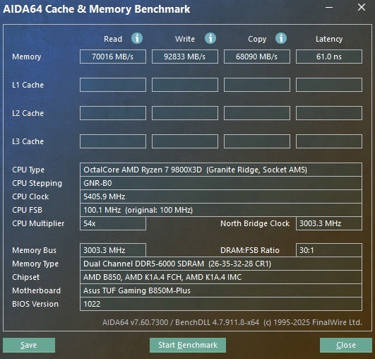 讀:70016MB/s  寫:92833MB/s  複製:68090MB/s