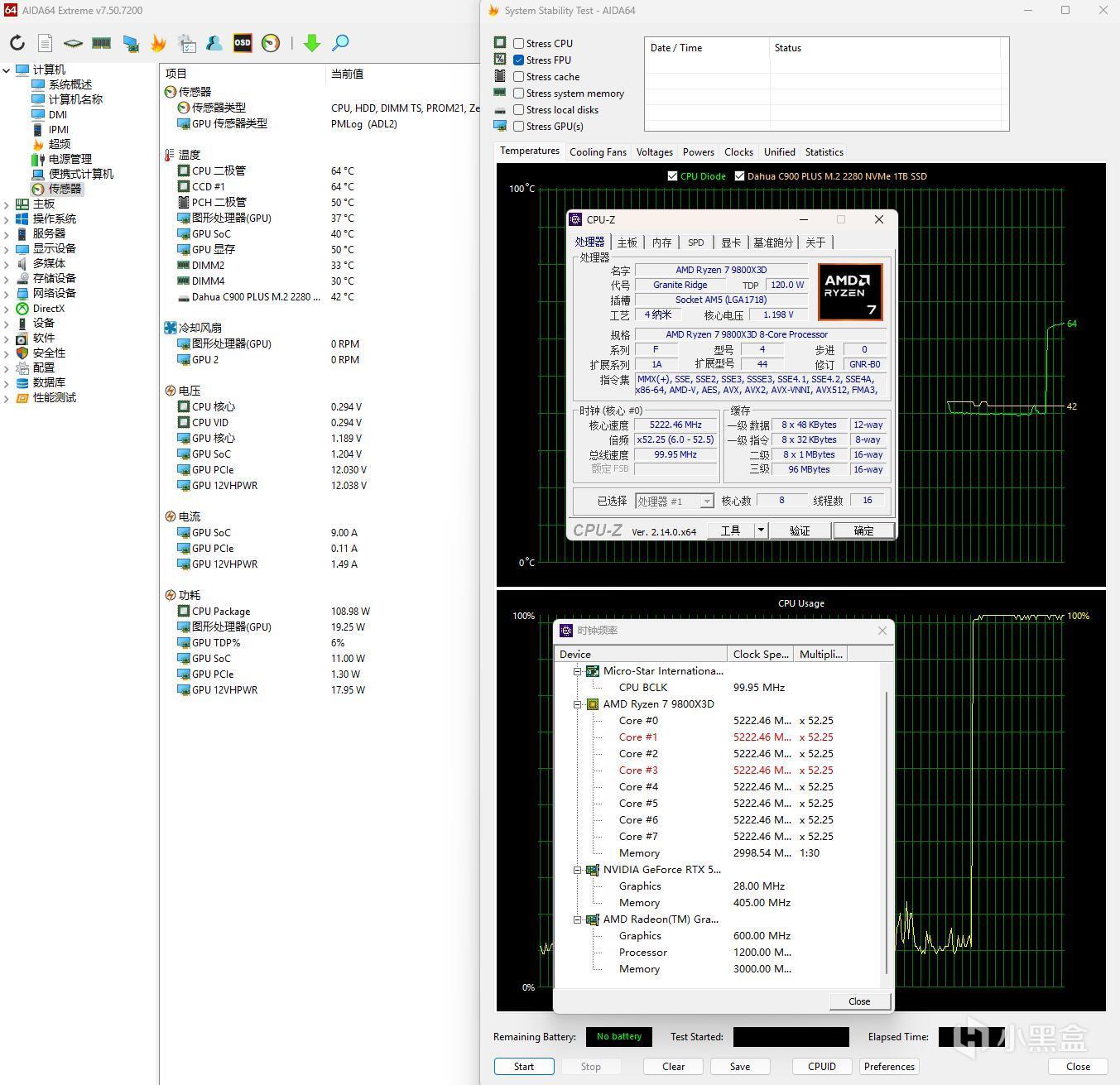 ▼跑個CPU-Z的壓力測試,處理器功耗在110W左右,全核心睿頻5.3GHz左右,溫度在64℃左右。