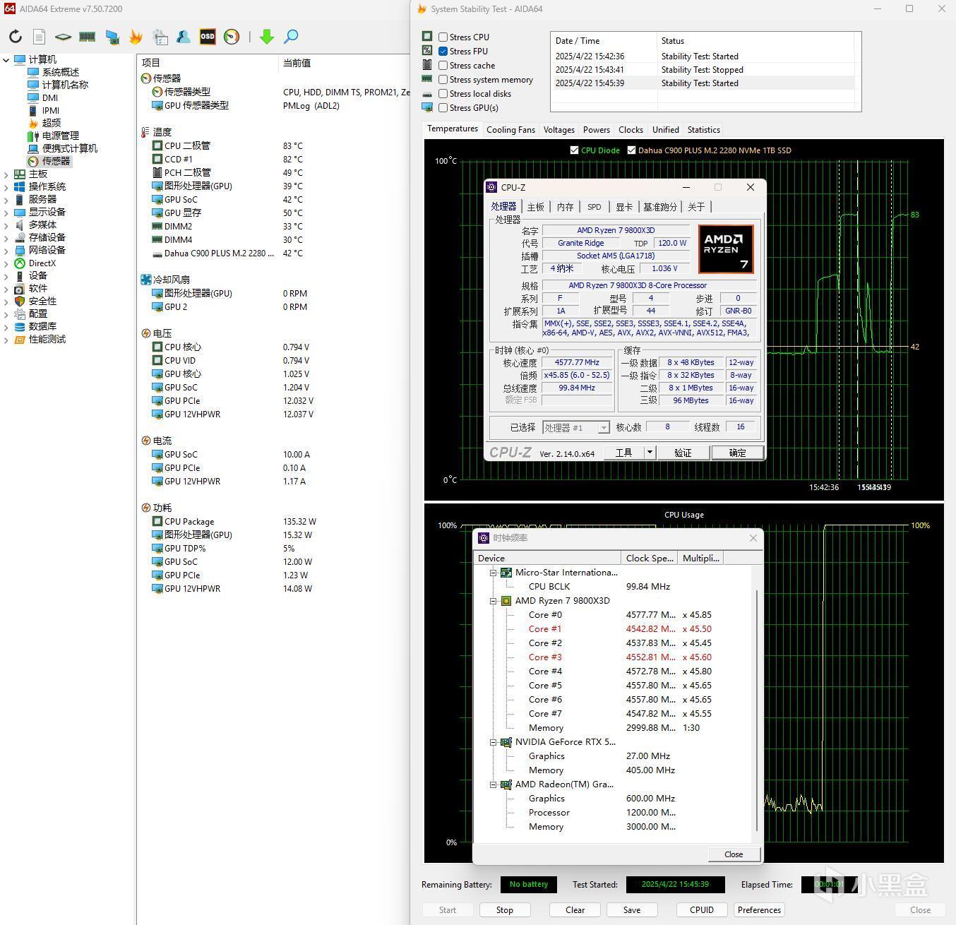▼單烤FPU測試,處理器功耗在140W左右,全核心睿頻4.6GHz左右,溫度在82℃左右。