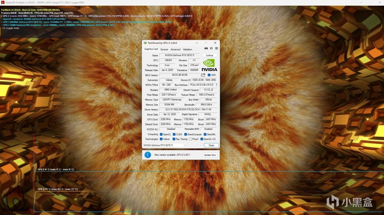 ▼跑個甜甜圈測試,顯卡的核心溫度穩定在71℃左右。