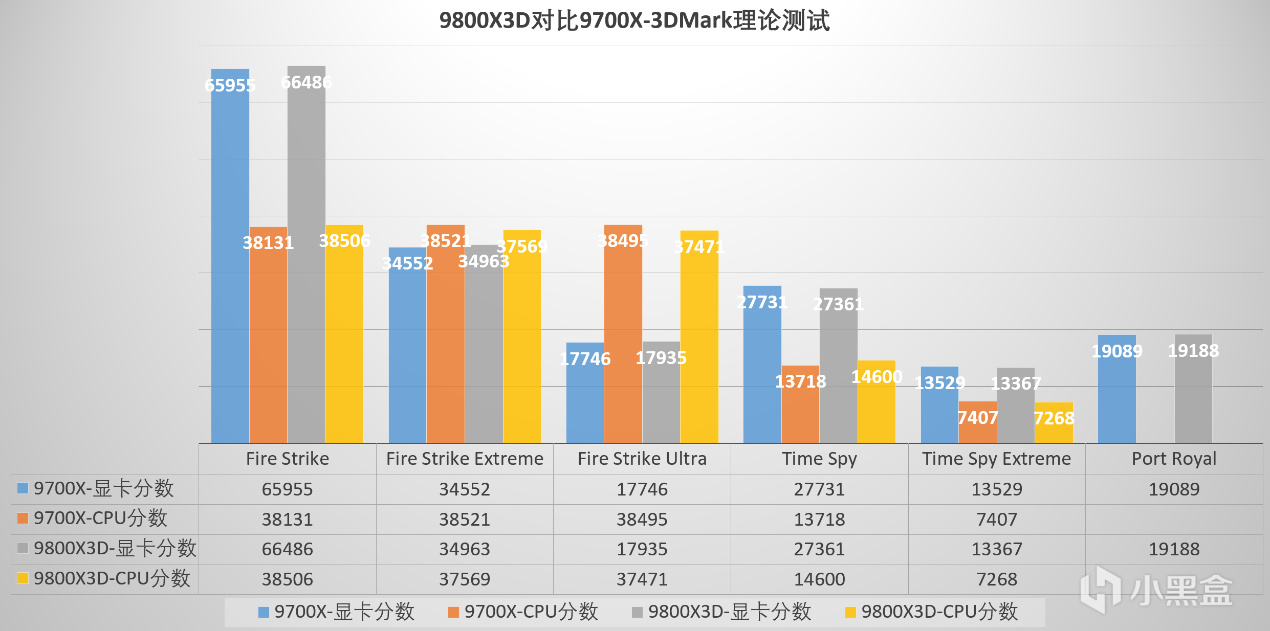 ▼跑個3Dmark的理論性能測試,9700X和9800X3D的區別很小,幾乎完全一樣,只是略有波動。