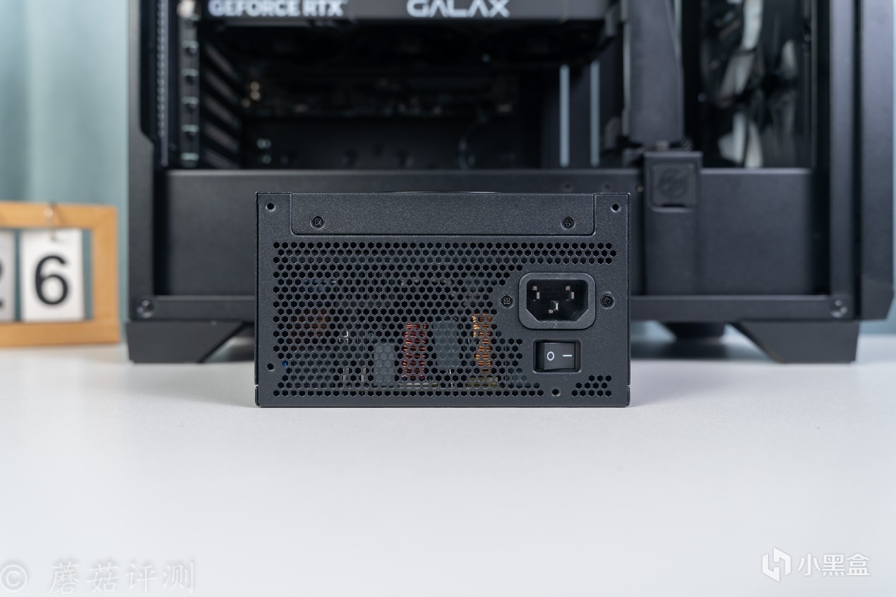▼電源尾部,熟悉的電源插口下面是電源開關,這個開關使用了半嵌入式設計,可以有效防誤觸。透過電源尾部的金屬衝孔網,可以看到電源的二級EMI電路非常完整,左側有兩顆並聯的整流橋,並在兩顆整流橋中間夾着一個金屬散熱件,輔助器散熱,保證穩定運行。