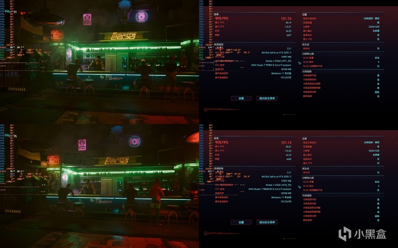 ▼賽博朋克2077,2K分辨率,光追超級畫質,拼好幀關閉,9800X3D和9700X的表現伯仲之間,幾乎完全相同,都是101幀左右。