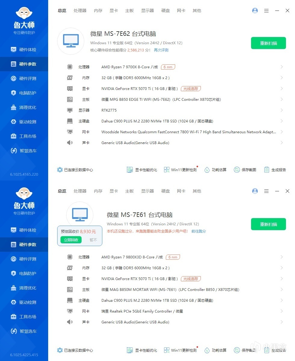 ▼整機配置一覽,處理器是9700X和9800X3D,主板是微星的B850刀鋒和B850M迫擊炮,其實差不多。