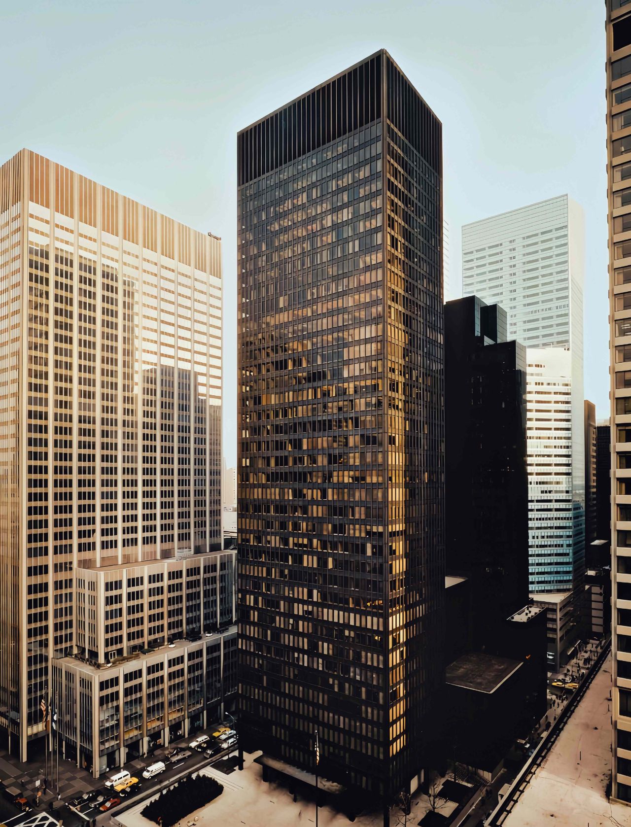 這座香檳色的美樓外觀平整,沒有一絲裝飾。其藝術魅力是靠恰到好處的比例,高貴的質感與色彩,對光的捕捉和利用,精細的設計、選材、施工實現的。西格拉姆大廈也借鑑了沙利文高層建築三段式的原則。