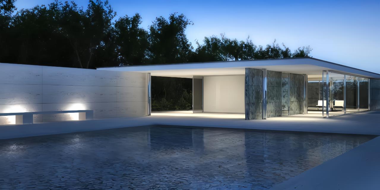 說的樸實一點,這座房子其實非常小,而且簡單到不能再簡單。甚至在當時的人看來就不能算是一座“建築”。整個房子只是由幾根孤零零的柱子支撐起的鋼筋混凝土屋頂,四周用幾片大理石和落地玻璃圍合而成。室內除了一座人體雕塑和幾把密斯自己設計的椅子,就沒有任何的傢俱了。