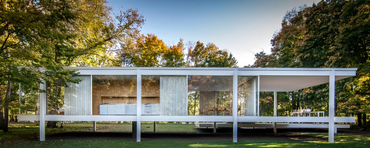1951年,65歲的密斯在芝加哥市郊的布萊諾完成了他現代主義理想下史詩般的作品。這座鋼結構建築表面完全被玻璃覆蓋,讓住戶與周圍田園詩般的環境完美地結合在了一起,在現代,這件作品也被人當作一件驚世名作來崇拜。