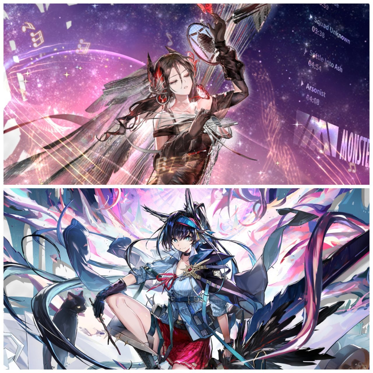第二名音律聯覺,聽名字就知道這個系列是從鷹角的音樂會延伸而來,由此也歸類進鷹角每次週年的週年系列當中,其中銀灰的動態小雪豹、薩卡茲大姑娘的禮服彰顯身材同時又不失優雅,而最早一期的音律聯覺👉好兄弟&愛妻煌的鼓手裝更是盡顯本人性格,透氣吸汗的幾塊布料只能遮蓋關鍵部分,隱約可見的人魚線,因爲熱汗披散的長髮和充滿挑釁的眼神讓你能隔着屏幕都感受來自煌的灼熱情緒和體溫