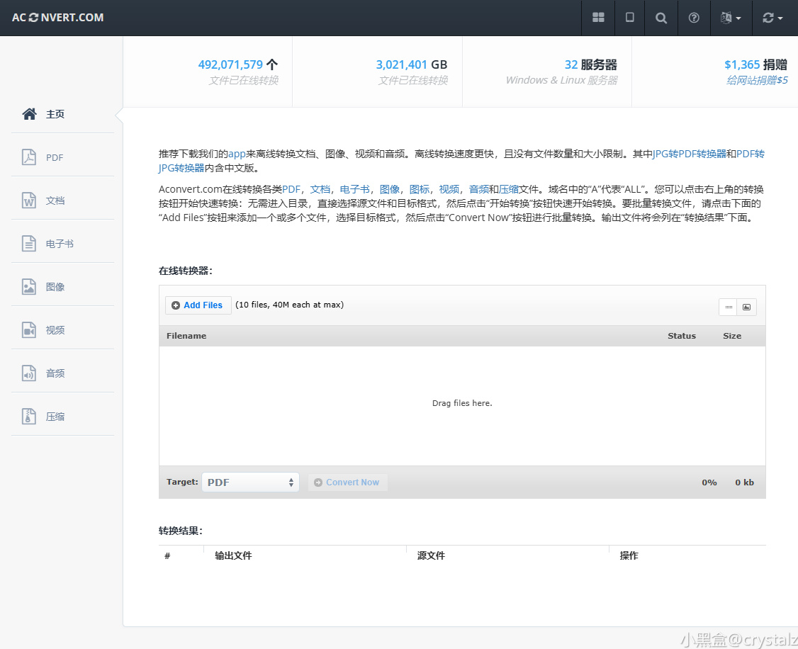 網站非常良心,沒有任何文件大小和數量限制,可以用來在線轉換各種 PDF、文檔、圖像、圖標、視頻和音頻等格式文件。