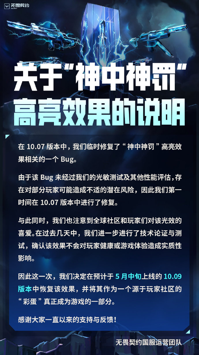 又比如,《無畏契約》國服前陣子出了“神中神罰”的皮膚輿情,被玩家認定是故意靠bug割韭菜,但很快官方就做出了正面回應,拿出了玩家都滿意的解決方案,並在公告中肯定了玩家社區的力量。