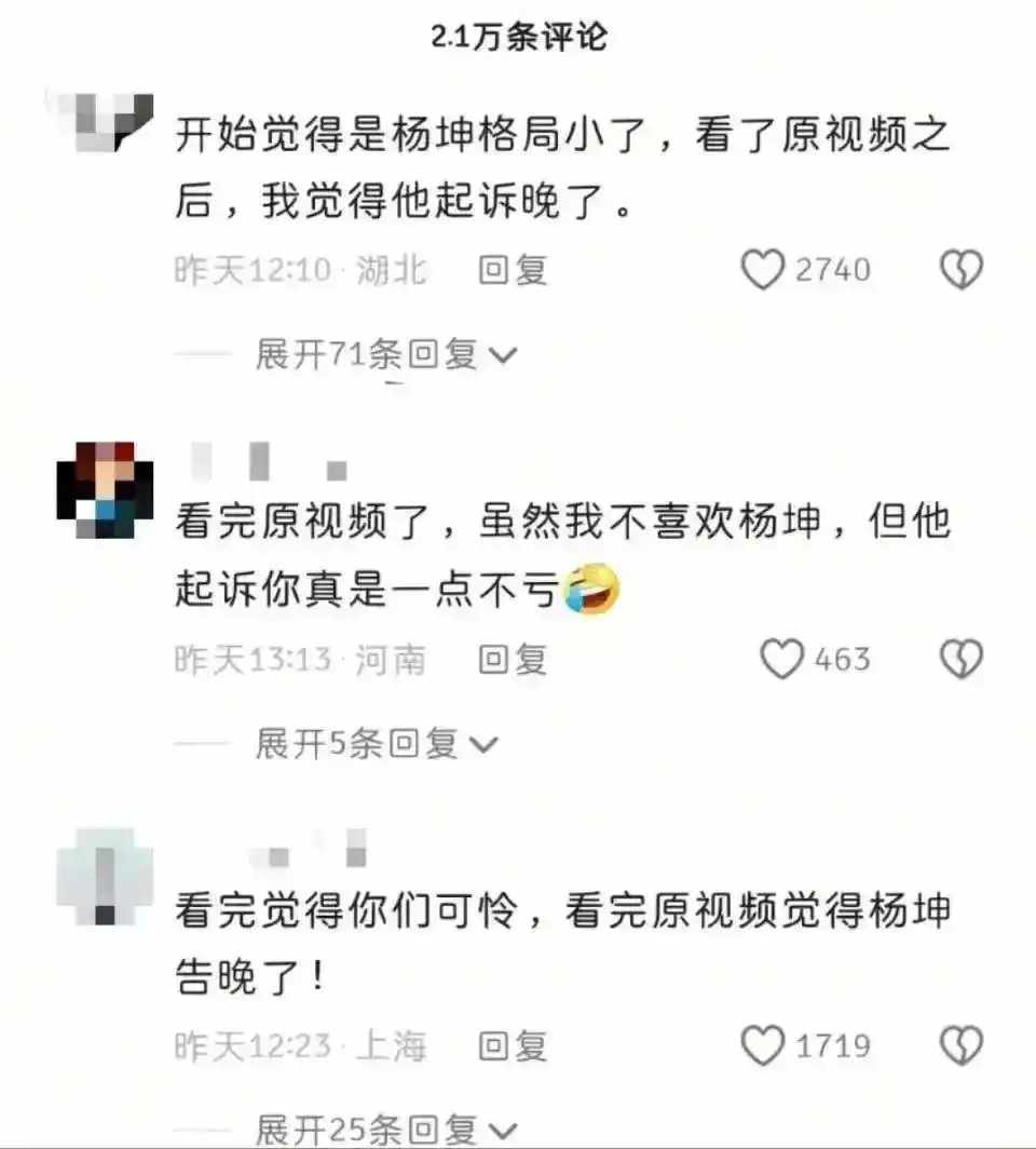 楊坤稱最初僅通過平臺投訴,但對方非但未收斂,反而利用訴訟事件炒作,甚至將法院傳票作爲“流量密碼”,推出挑釁性內容,迫使其採取法律手段維護名譽和網絡環境底線。