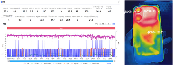 紅米 Turbo 4 Pro 開局就畫圖,在 15 分鐘撞了溫控牆後變得相對穩定;而一加 Ace 3 Pro 在 20 分鐘撞了溫控牆,前後的幀率都穩成一條線。