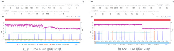 開啓 120 幀模式,紅米 Turbo 4 Pro 半小時平均幀率 101 幀;一加 Ace 3 Pro 半小時平均幀率 107.6 幀。別看平均幀率差的不多,但這穩定性可是一個天上一個地下。