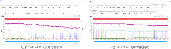 果然,系統重置後的測試成績就正常多了,均衡模式下紅米 Turbo 4 Pro 平均幀率 51.7 幀,但對比一加 Ace 3 Pro 的 56.2 幀還是有差距。