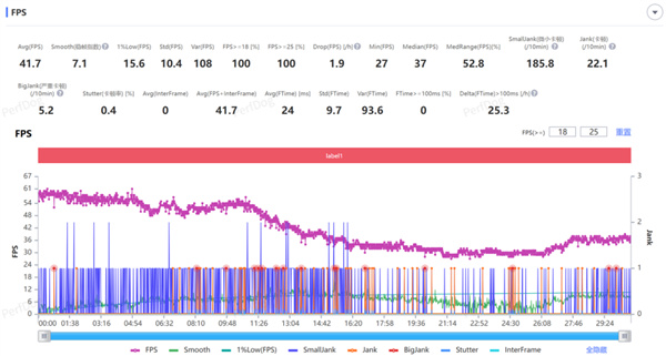 根據 PerfDog 的測試,原神須彌城跑圖,均衡模式,畫質選擇高,幀率手動調到 60 幀,紅米 Turbo 4 Pro 剛開始幀率波動就非常大,半小時平均幀率只有 41.7 幀。