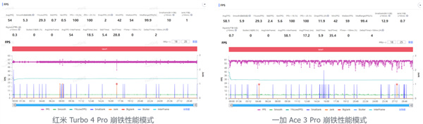 而兩邊都開啓性能模式之後,情況就不太一樣了。半小時測試下來兩臺手機都能流暢運行,紅米 Turbo 4 Pro 的平均幀率跑到了 59.9 幀,雖然紅米 Turbo 4 Pro 幀率還是有些波動,沒有一加 Ace 3 Pro 那麼穩,但平均幀數相比於一加 Ace 3 Pro 的 59.5 幀,還要更高一點。