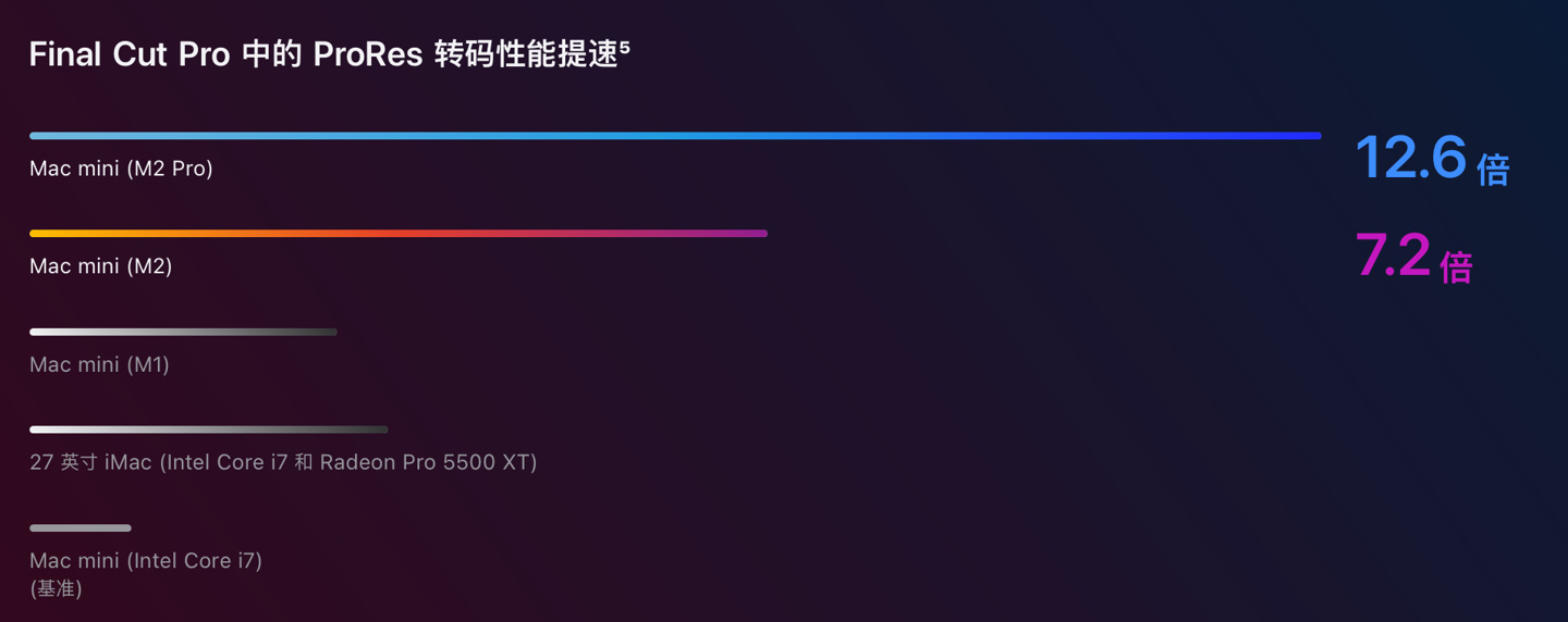 在苹果自家的 Final Cut Pro 软件中,有全新神经网络引擎和媒体引擎加持的 M2 和 M2 Pro 版 Mac mini 相比上代提升很大,更是达到了 i7 版的 18.8 倍。