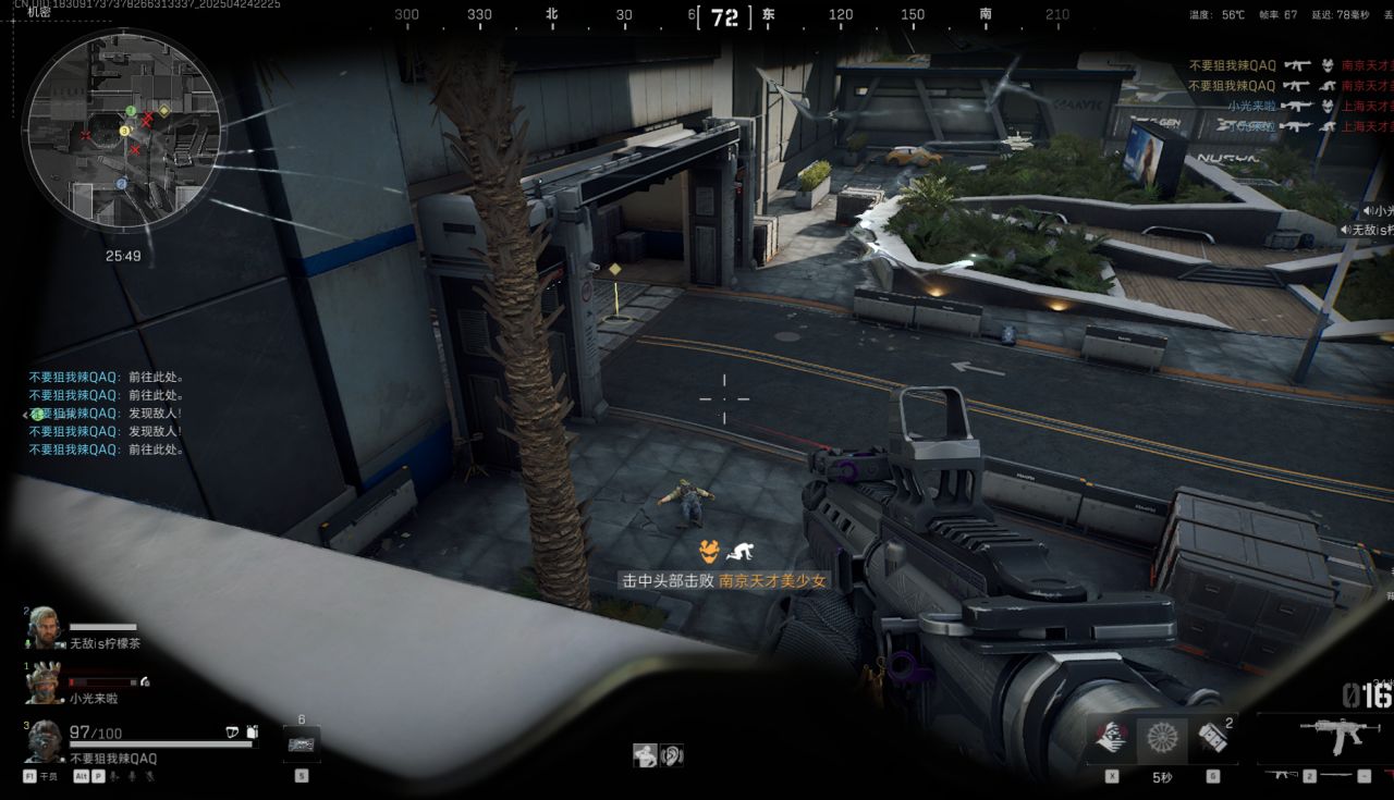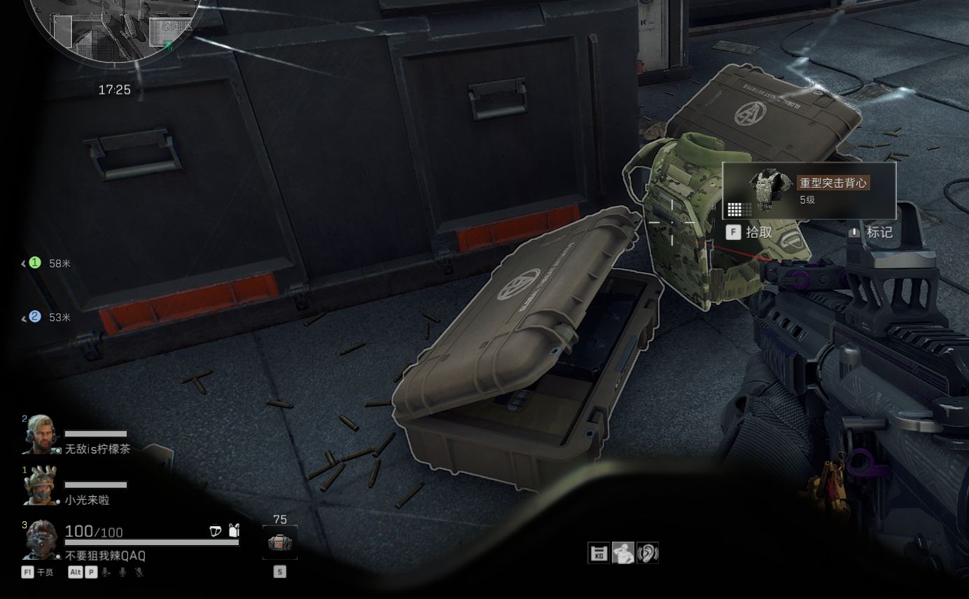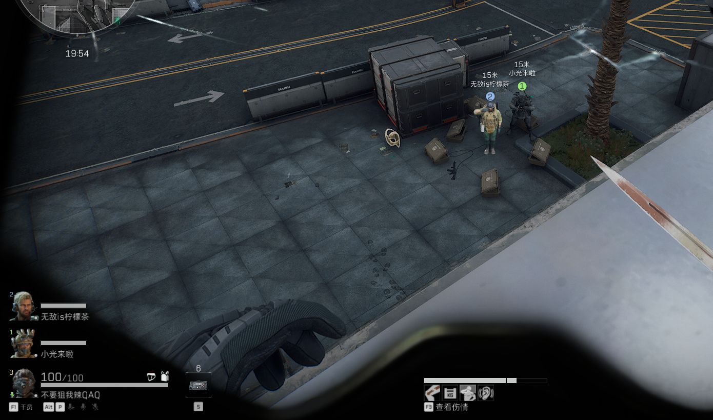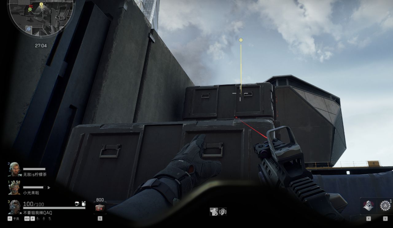 在做完折翼行动后或者做折翼行动期间大概率会有1-2队人在附近的,这时候我们不要着急去吃折翼行动的航空箱。我们继续在趴下的点位然后往旁边看,旁边的这个箱子是可以攀爬到上面的,而且上面视野非常开阔几乎可以架到门口周边所有区域,如果有两队人在附近而且有自信打的过他们的话可以在上面看他们打架的同时偷一两枪看看能不能同时吃两队人,鼠鼠这里就是偷偷摸摸在上面看他们打架然后成功爽吃两队。