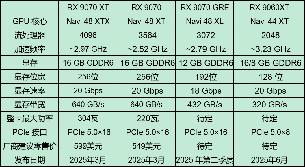 RX 9070 GRE 將搭載 Navi 48 核心,擁有 3072 個流處理器,配備 12GB GDDR6 顯存和 192 位顯存位寬。此外,顯存等效速率將降至 18 Gbps。
