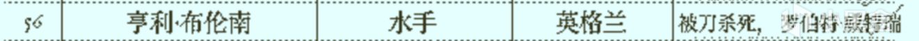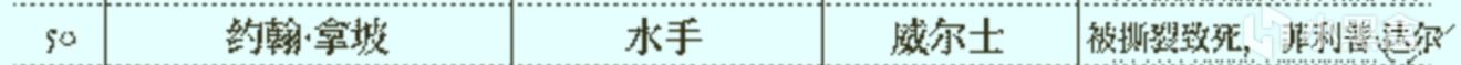 人物推斷:排除法,7-2中在場的14人中,主甲板上三人爲四副和他的乘務員,36號波斯人,下層畫家正在死,旁邊是大副乘務員,43,44,45,56,x牀上有人,三副和他的乘務員,在喝酒的41和59,而空牀有36,41,48,49,57和一條斷裂的牀,在7-1中48打死49與事務長和未知水手逃離,而36,41和斷裂牀身份都已經確定,剩下的空牀57就是逃離的未知水手了