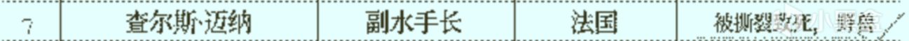 人物推斷:2-3對話中查理爲查爾斯的暱稱(術語介紹裏見習船員其實是預備官員,地位比較高,所以屠夫稱呼是長官,別被誤導了)雖然查爾斯有兩個,但這位在素描圖中站位是見習三人組裏的,而且表現也不像個副水手長