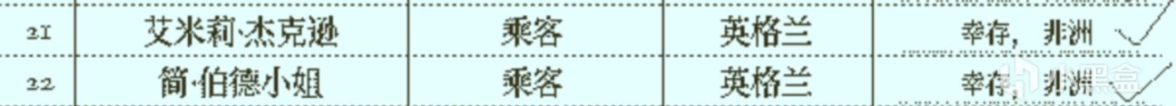 乘客組中另外六名均殞命,剩下兩名在7-8中船長室旁邊可以看到,兩位乘客稱呼不同點是一位使用小姐作爲稱呼,說明是未婚,觀察7-8其中有一位戴了戒指,因此爲已婚的艾米莉,且9-1與醫生一起乘船,因爲醫生倖存因此她們也活下來了