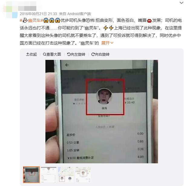 但你別說,類似的事件在國內還真發生過,比如曾經轟動一時的幽靈車事件,明明沒上車就開始莫名其妙計費,想打司機的電話卻怎麼也打不通,關鍵是這些司機的頭像還一個比一個陰間,和如今我們認知中的僞人幾乎一摸一樣,只是當時國內並沒有“僞人”這一概念,所以相關的事件一律用幽靈車來替代了。