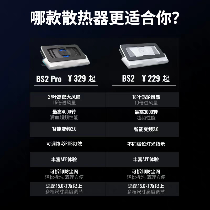 從宣傳數據來看,BS2相比BS1提升了轉速與降噪效果,增加了可拆卸防塵網,新增了自定義變頻轉速的功能,且BS2Pro會有可調炫彩RGB光效