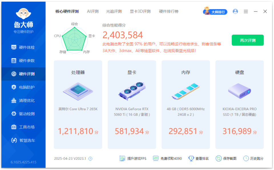 最後是喜聞樂見的魯大師,給影馳RTX 5060 Ti 聖刃MAX OC顯卡的分數爲581934分。