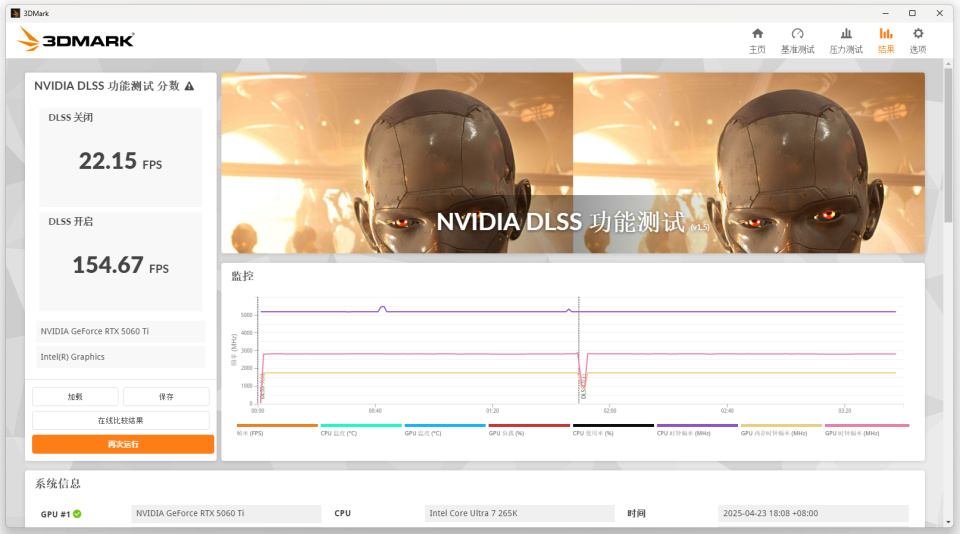 DLSS 4.0測試,影馳RTX 5060 Ti 聖刃MAX OC顯卡開啓4X幀數爲154.67FPS,關閉後爲22.15FPS。整體提升了598%。