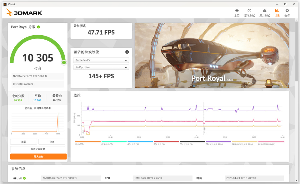 Prot Royal測試,影馳RTX 5060 Ti 聖刃MAX OC顯卡的分數爲10305,其中顯卡測試成績爲47.71FPS。