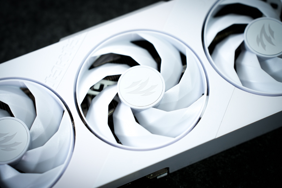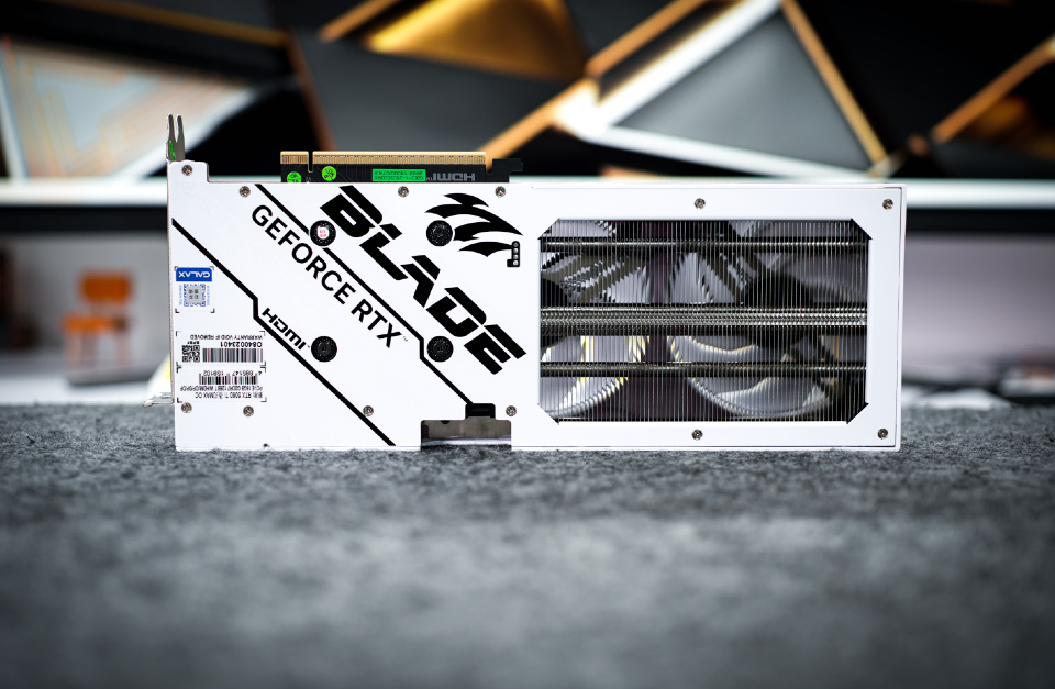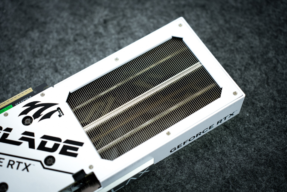 影馳RTX 5060 Ti 聖刃MAX OC顯卡的背面也保留了白色金屬背板,尾部則是大面積鏤空設計,目的是爲了進一步提高整體散熱。