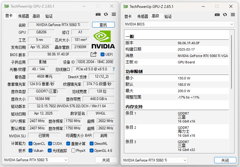 通過GPU-Z可以看到,影馳RTX 5060 Ti 聖刃MAX OC顯卡搭載的是GB206-300-A1核心,擁有36組多單元流處理器,4608個CUDA核心,並搭載36個第4代RT核心、144個第5代Tensor核心等,在媒體引擎方面配備1個第9代NVENC與1個第6代NVDEC。顯存方面,無論是16GB還是8GB版本均採用GDDR7顯存,位寬爲128Bit,由於顯存頻率高達28Gbps,帶寬均達到448GB/s。同時,GPU基礎頻率2407MHz,加速頻率2602MHz,TGP默認功耗180W,最大200W。