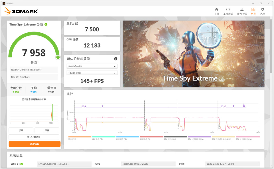 Time Spy Extreme測試,影馳RTX 5060 Ti 聖刃MAX OC顯卡的分數爲7958,其中顯卡分數爲7500。