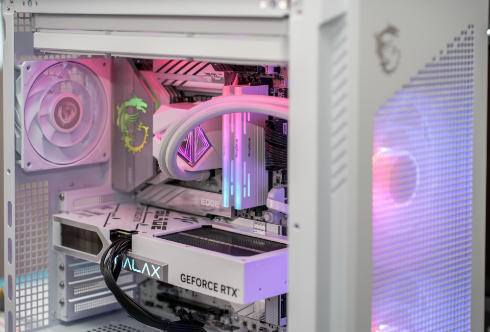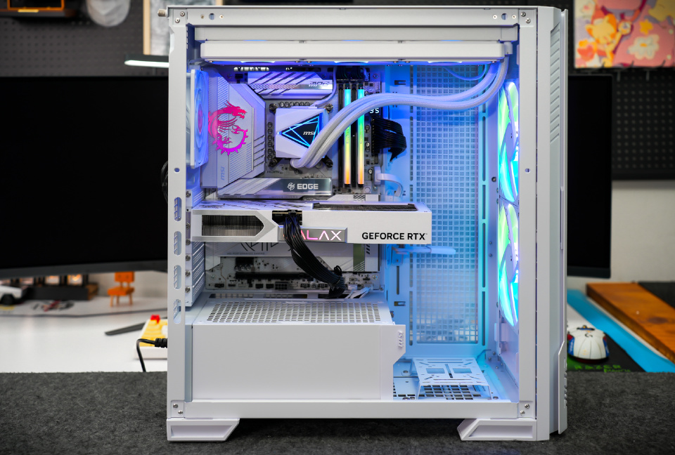 機箱則是用的最新的微星MPG VELOX 300R AIRFLOW PZ刀鋒機箱,該機箱定位是中塔機箱,內部空間極大,兼容性很強,還支持背插主板設計。最關鍵的是在散熱方面,機箱出廠就搭載了2個160mm大尺寸風扇,並且該風扇還採用了微星獨家雙螺旋結構設計,其扇葉由外環葉片和內環葉片組成。轉動時,兩套葉片會以不同速度旋轉,屆時會帶來兩股獨立氣流,這樣也能更快速的吸入機箱外部的冷空氣,進一步提高機箱內部的散熱。