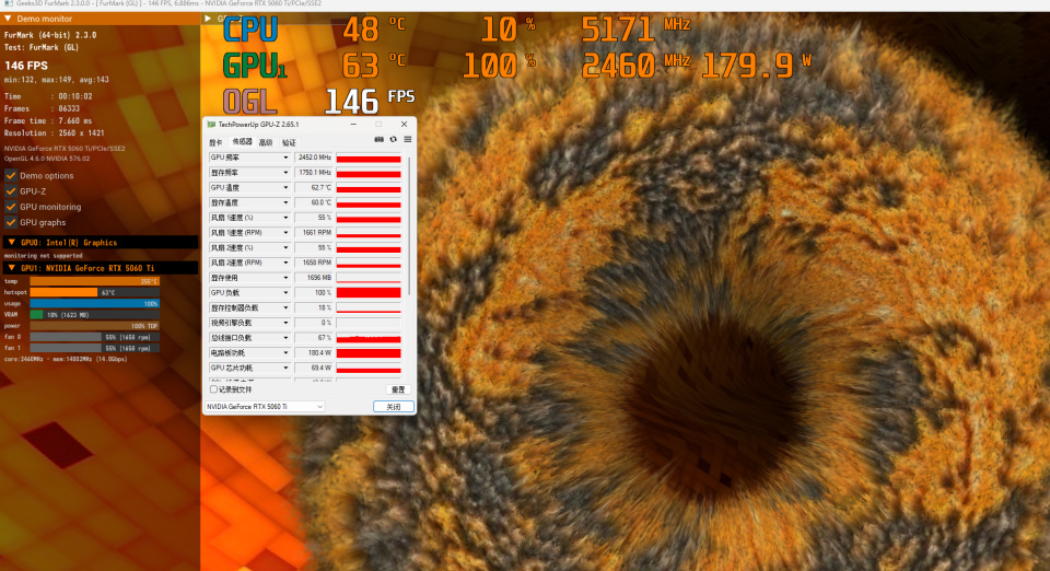 在室溫24℃情況下通過FURMARK 2.3拷機實測,影馳RTX 5060 Ti 聖刃MAX OC的滿載功耗在180W左右,核心最高溫度爲63℃,溫控表現非常不錯。