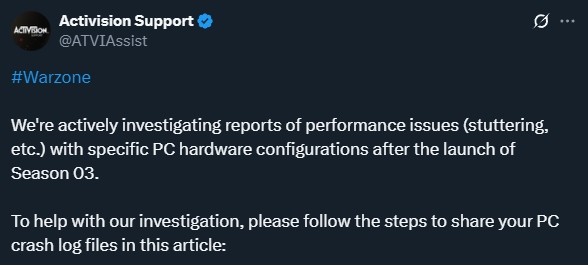 動視發佈公告,表示正在積極調查第三賽季發佈後,特定的PC端硬件設備在《戰區》中出現的性能問題報告(比如卡頓等),爲了幫助調查,可以在以下官網共享電腦崩潰日誌文件: