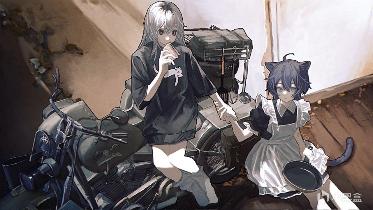ずもち老師爲遊戲繪製的插畫,啞光而暗灰色調渲染着末世的氣氛,少女三無的表情充滿着平靜,倆人互相寄託情感,交流生活細碎,在無人的末世下相互依存,相互依賴。
